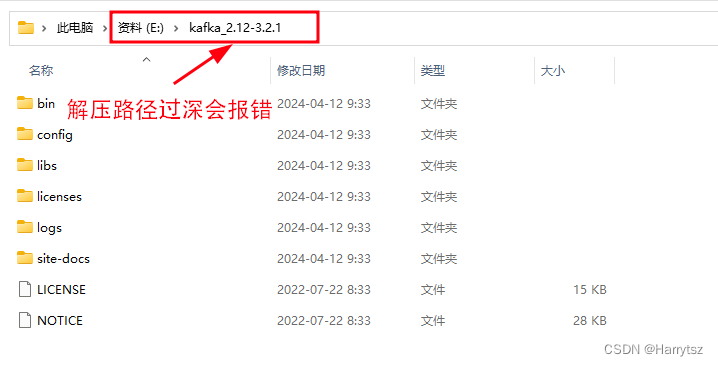 从 Kafka 官网上下载的 kafka_2.12-3.2.1 文件需要放置在路径较浅文件夹下解压,一旦放置的路径较深,会报错: